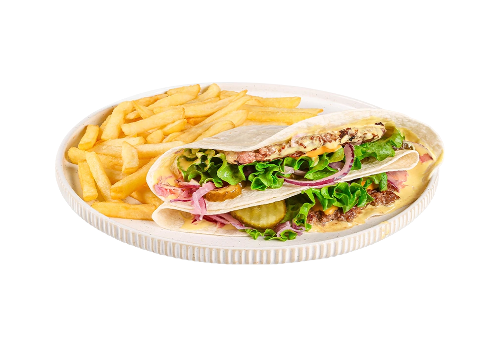 100% slovenskka govedina, cheddar, rukola, čebula, kumare, creamy mayo, krompirček.