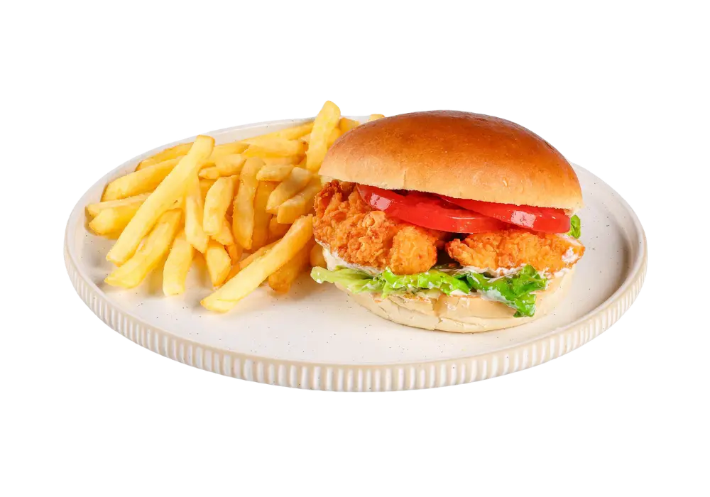 Ocvrt piščanec, solata, paradižnik, domača tatarska omaka, krompirček.