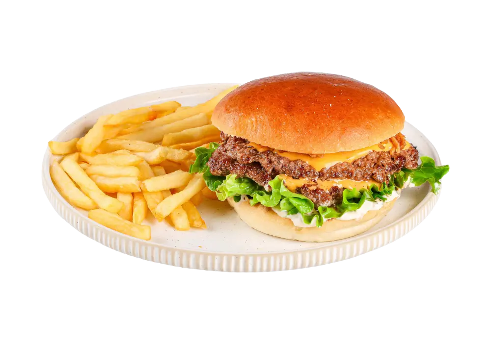 100% slovenskka govedina, cheddar, solata, paradižnik, čebula, hišna omaka, krompirček.