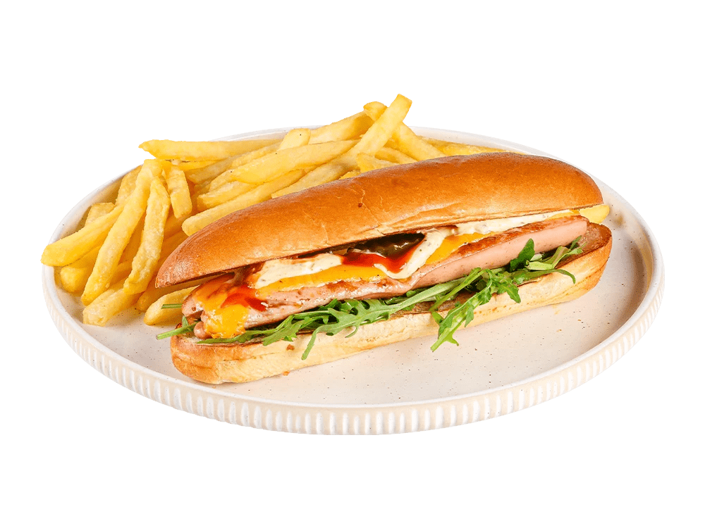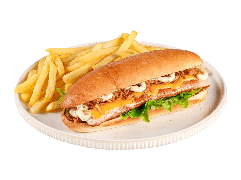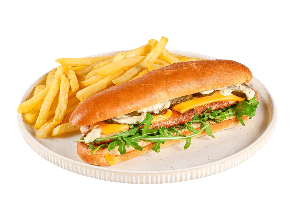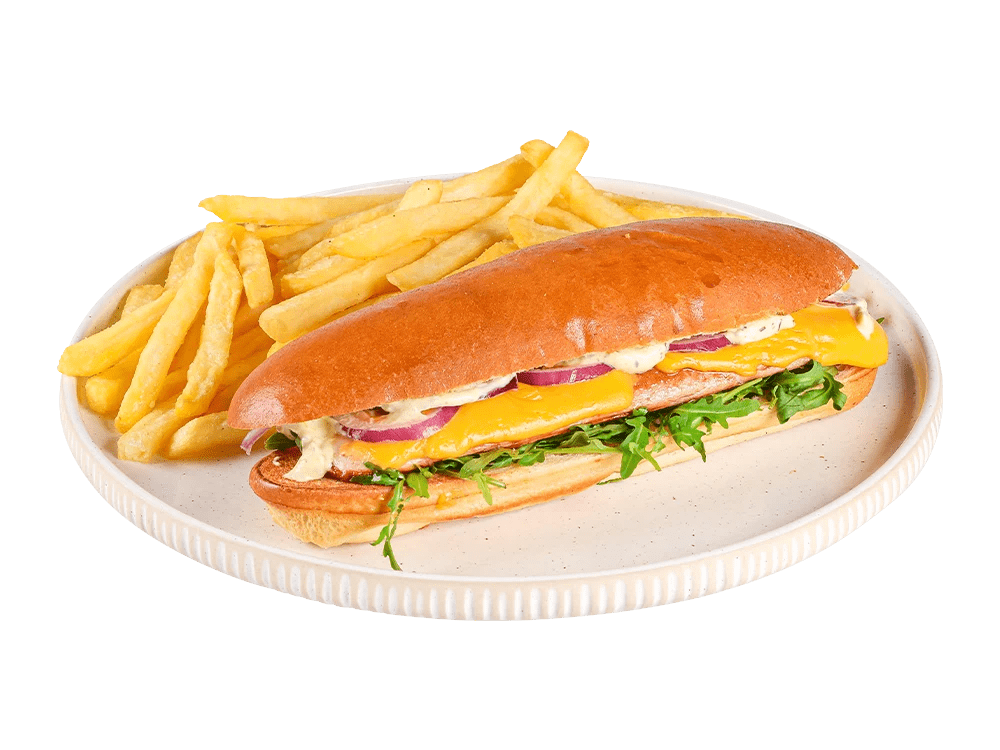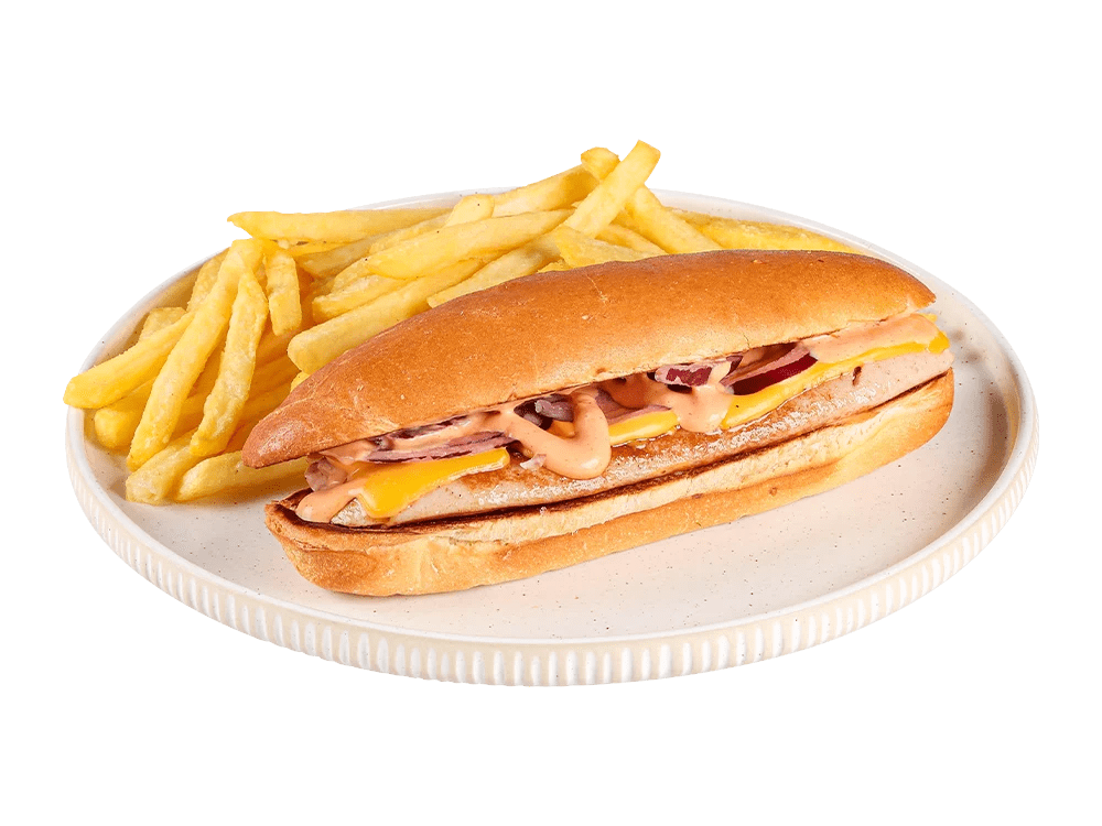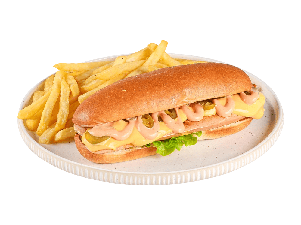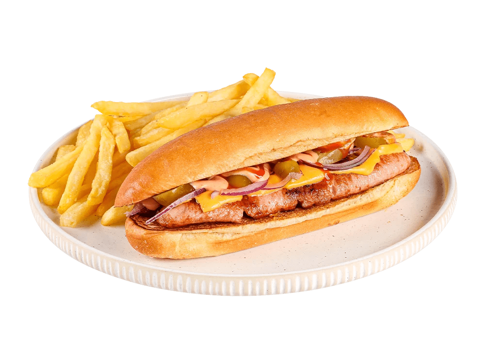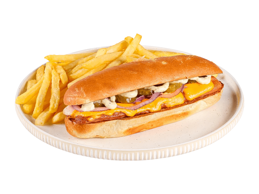 100% slovenska telečja hrenovka, cheddar, čebula, kumarce. Creamy mayo omaka.