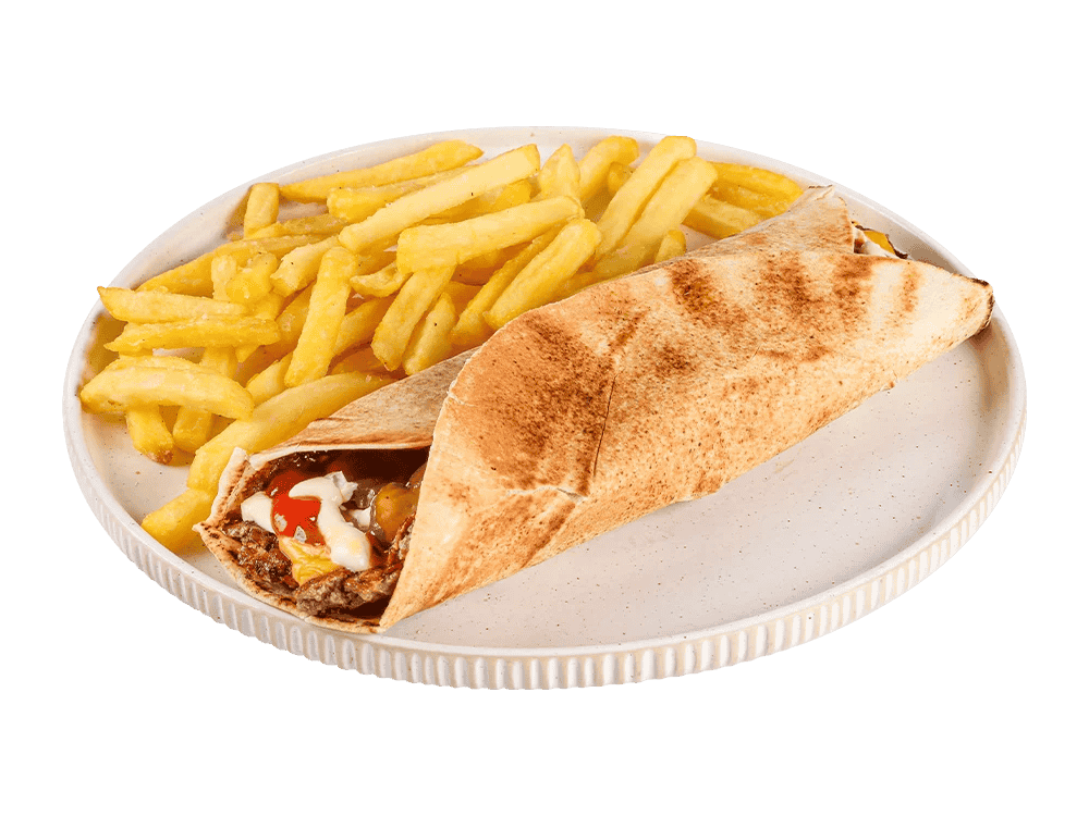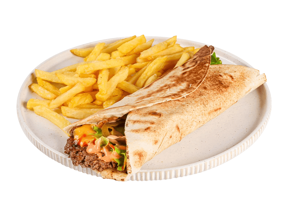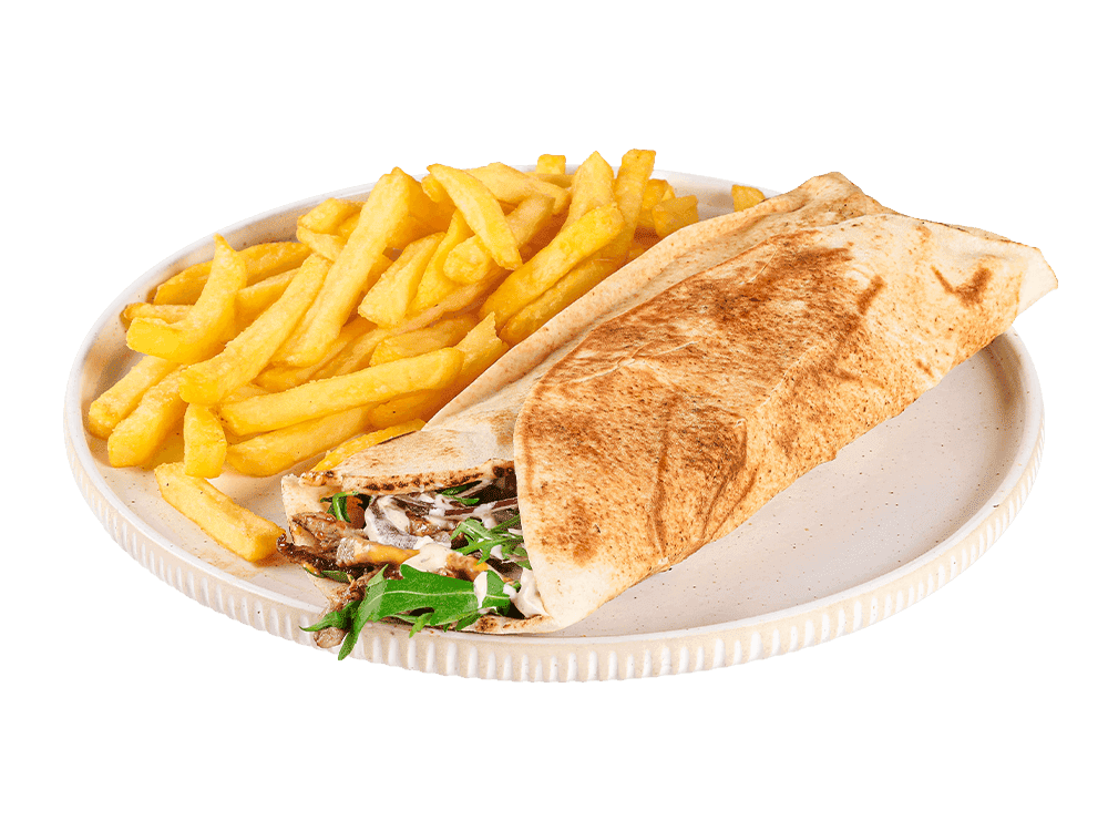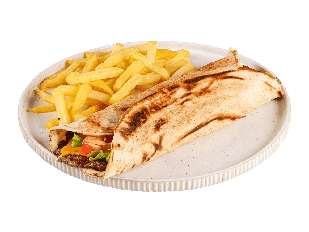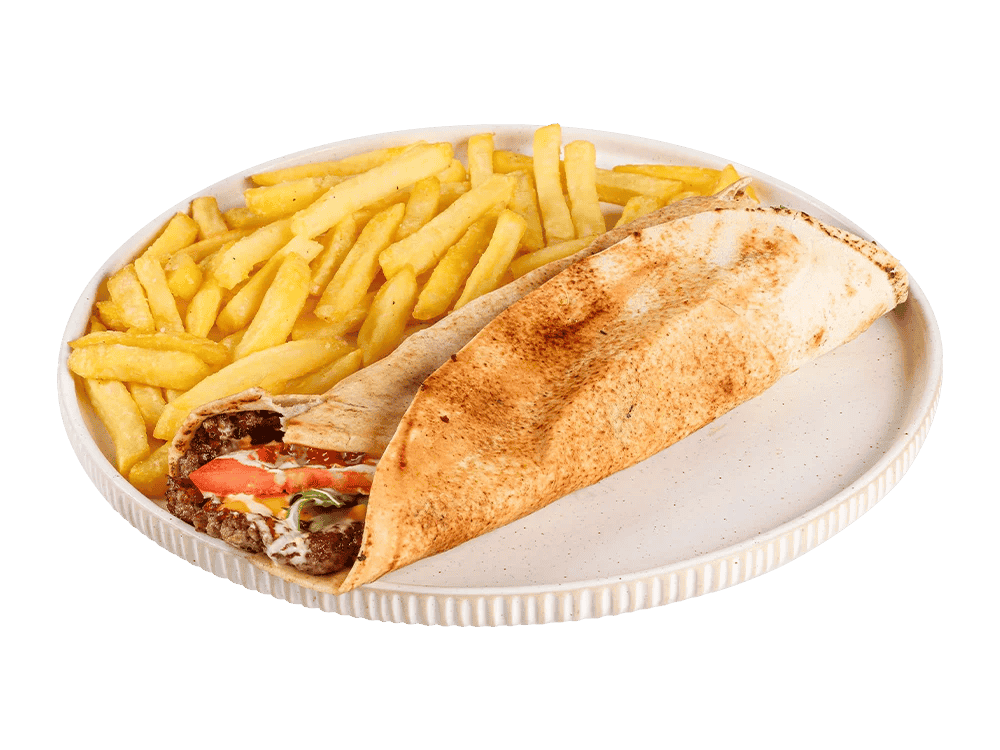 Zelenjavni polpet, solata, paradižnik, hummus mayo omaka, krompirček.