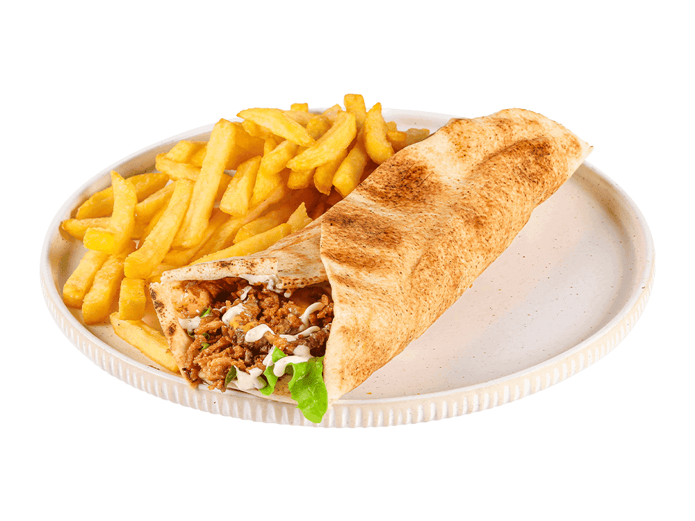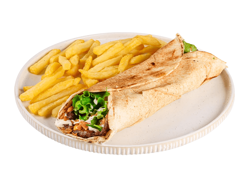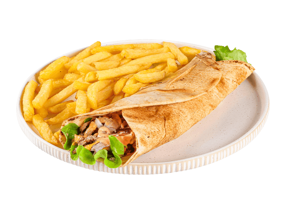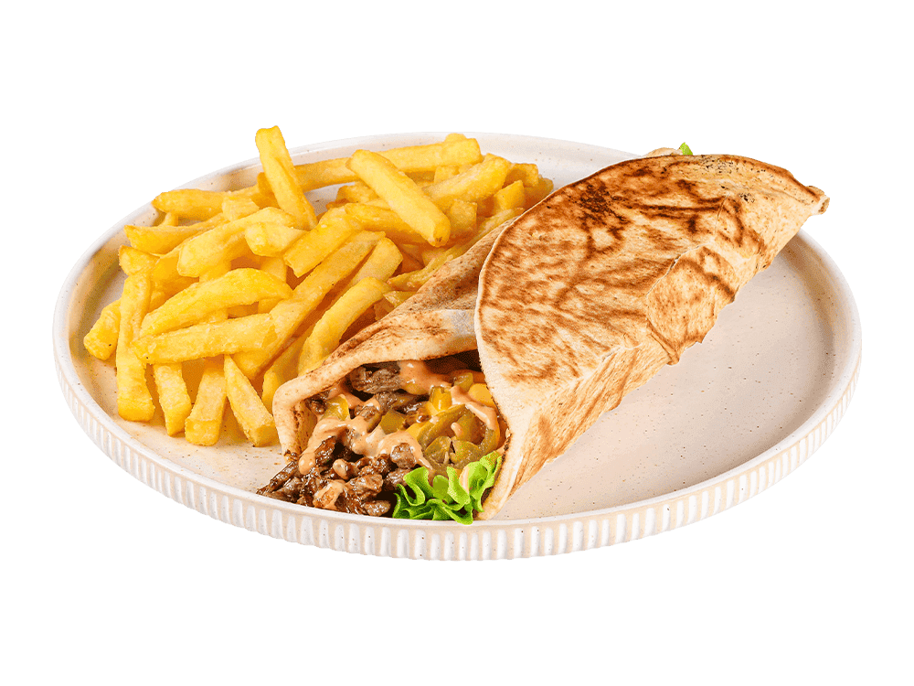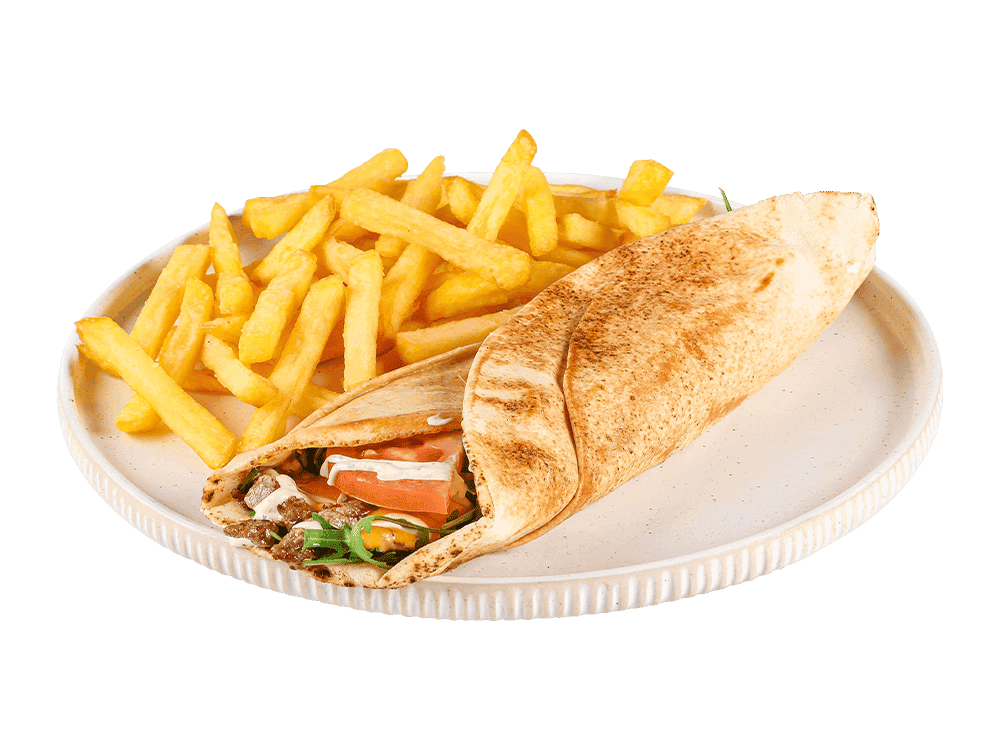 Zelenjavni polpet, solata, paradižnik, hummus mayo omaka, krompirček.