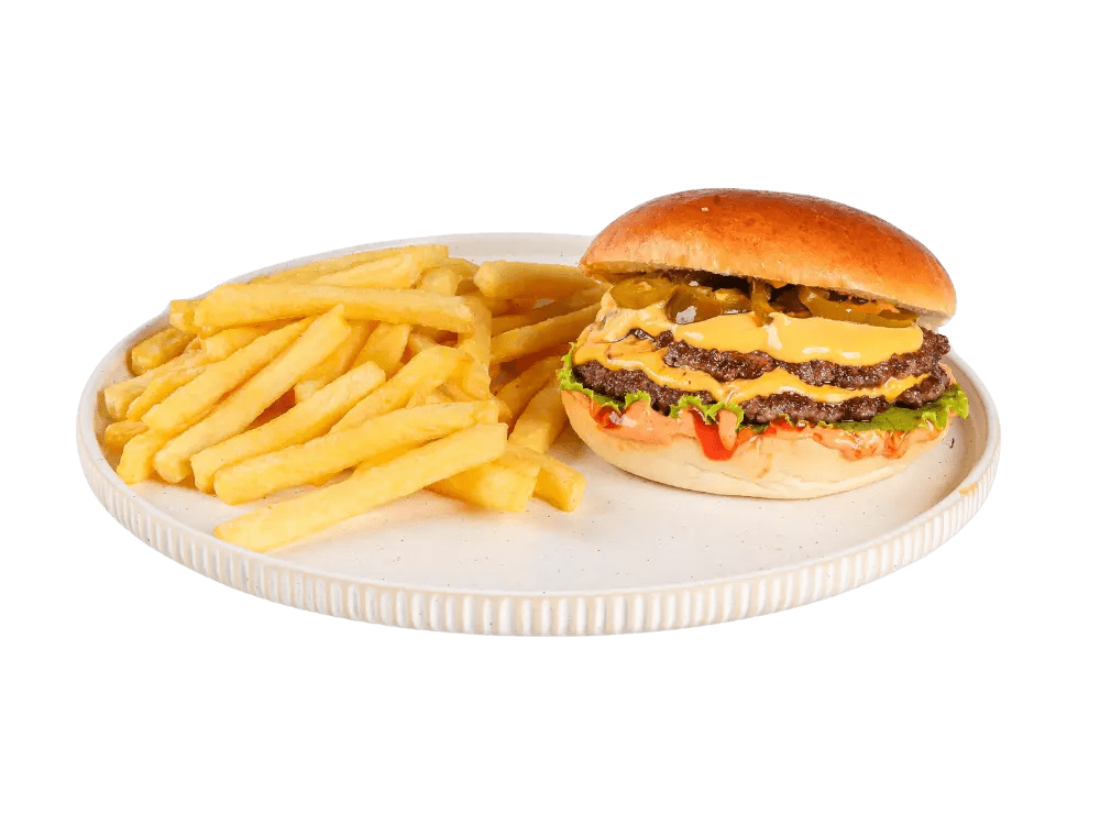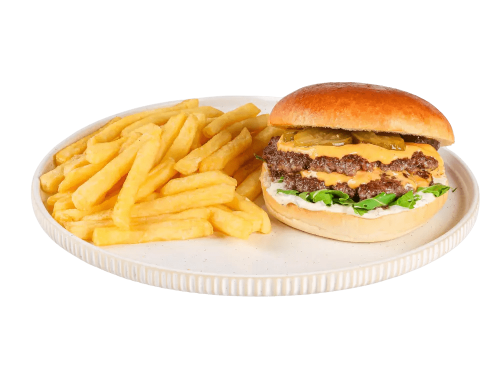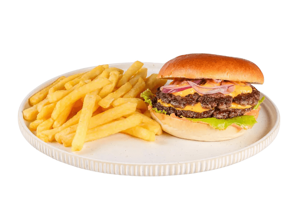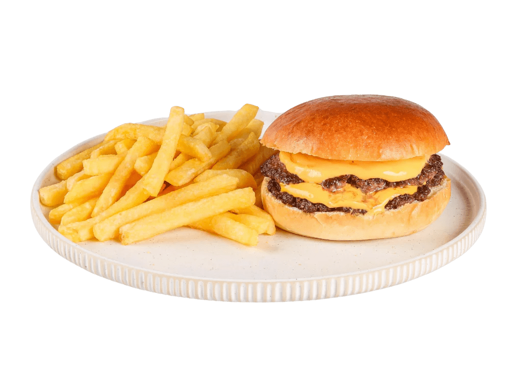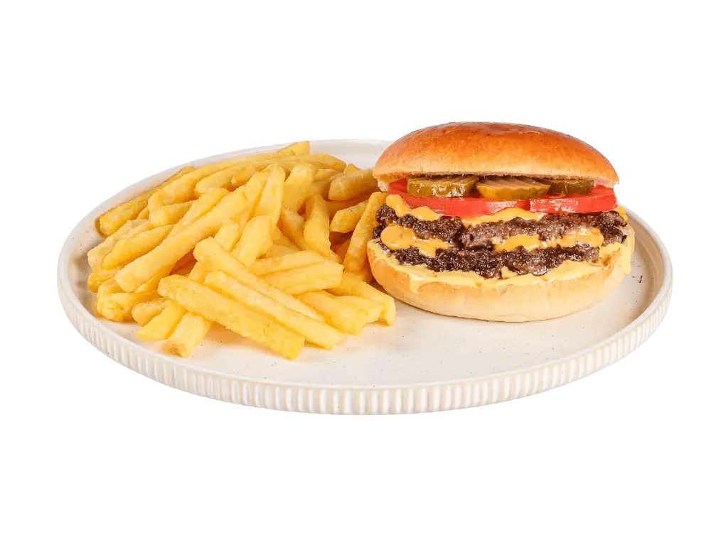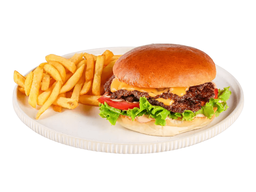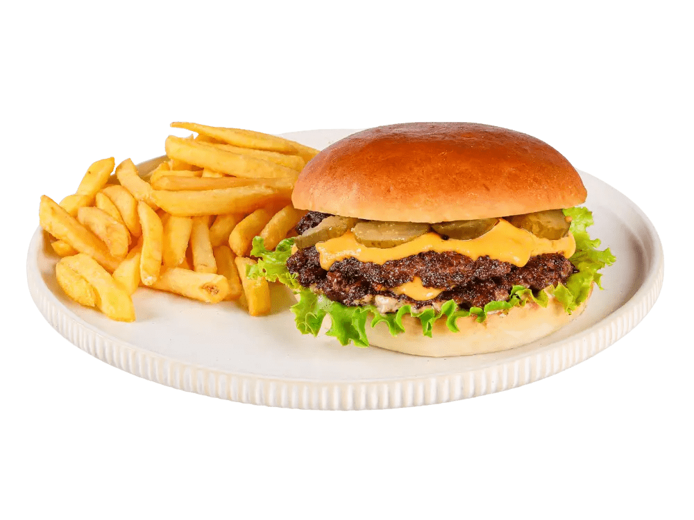 100% slovenska govedina, cheddar, čebula, solata, classic omaka, krompirček.