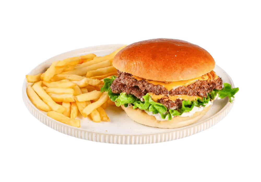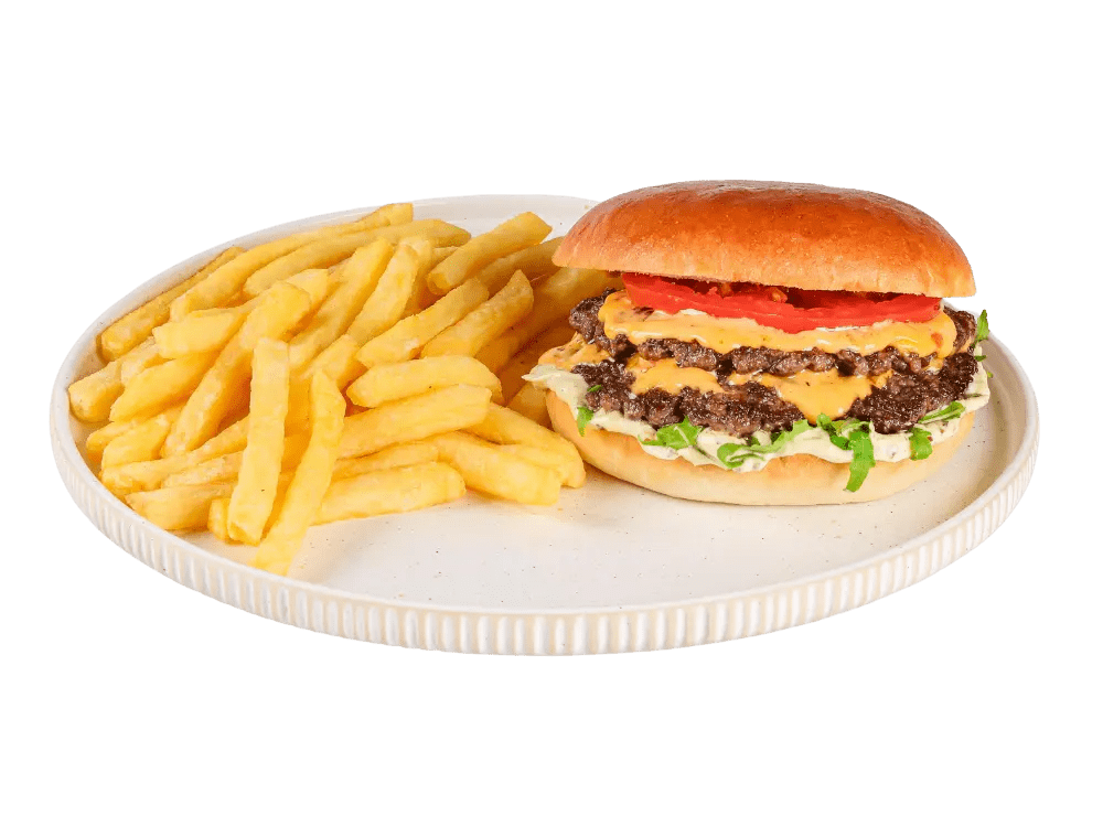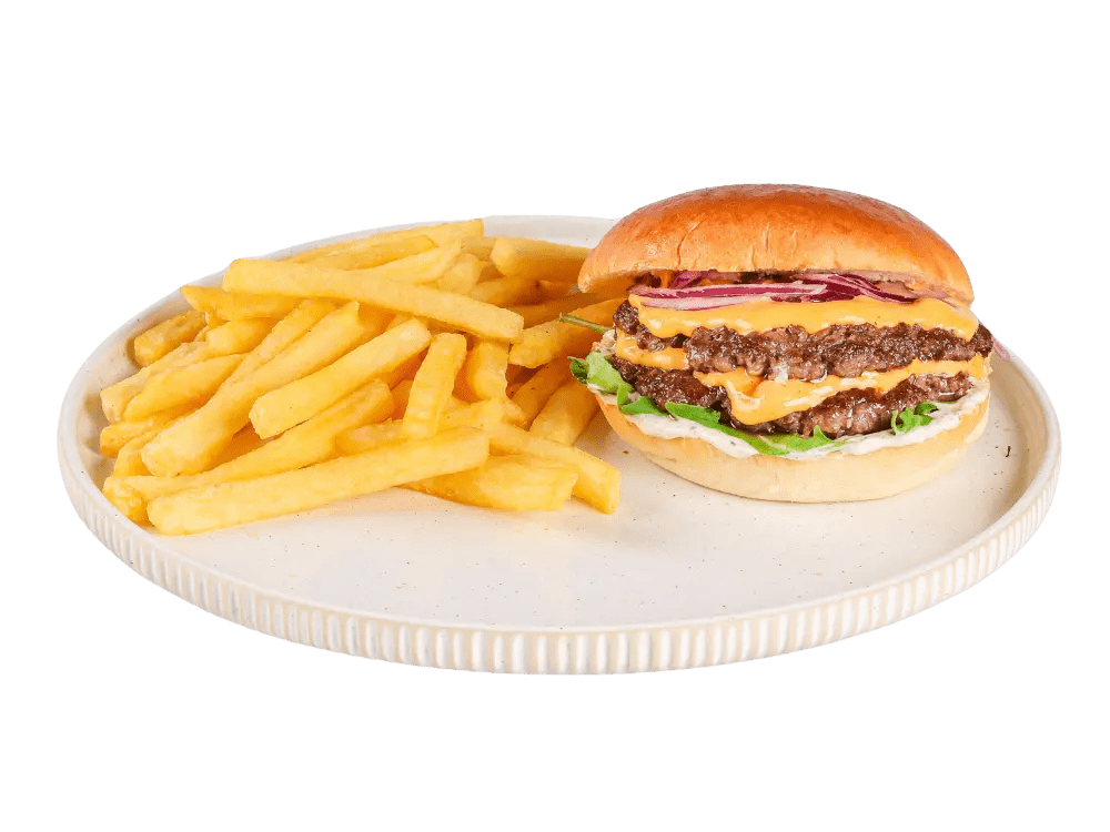 100% slovenska govedina, cheddar, solata, ocvrta čebula, garlic mayo, krompirček