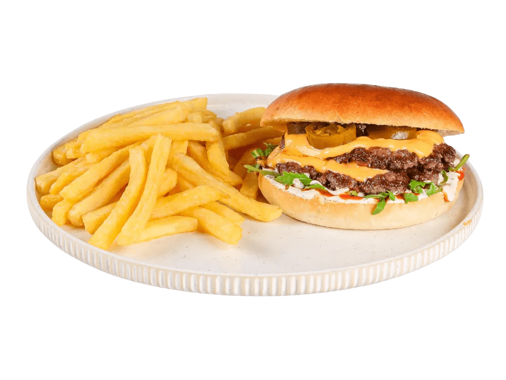 100% slovenska govedina, cheddar, rukola, jalapeno, truffle mayo, čili omaka, krompirček.