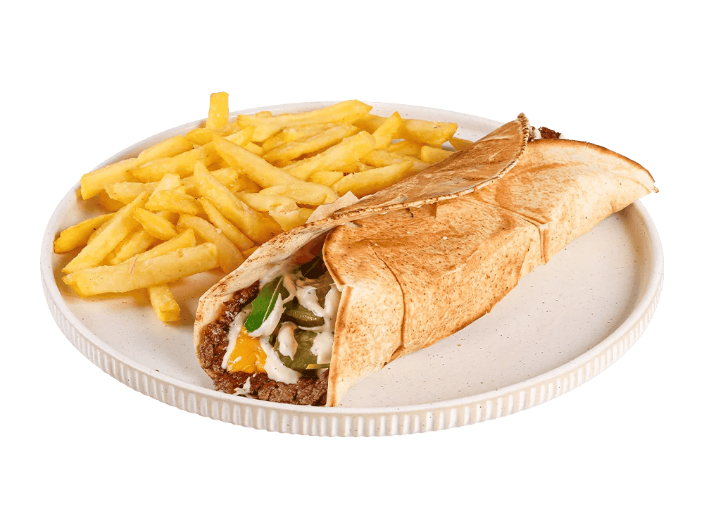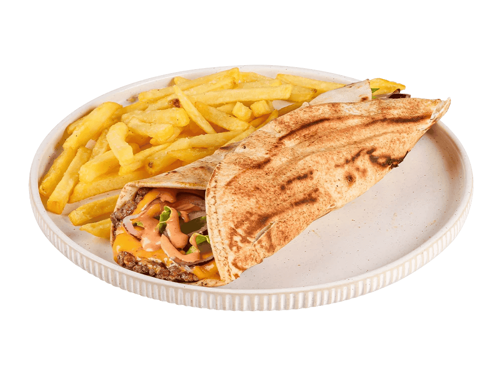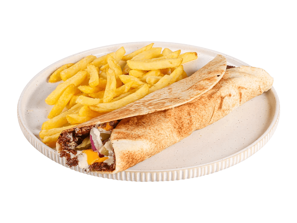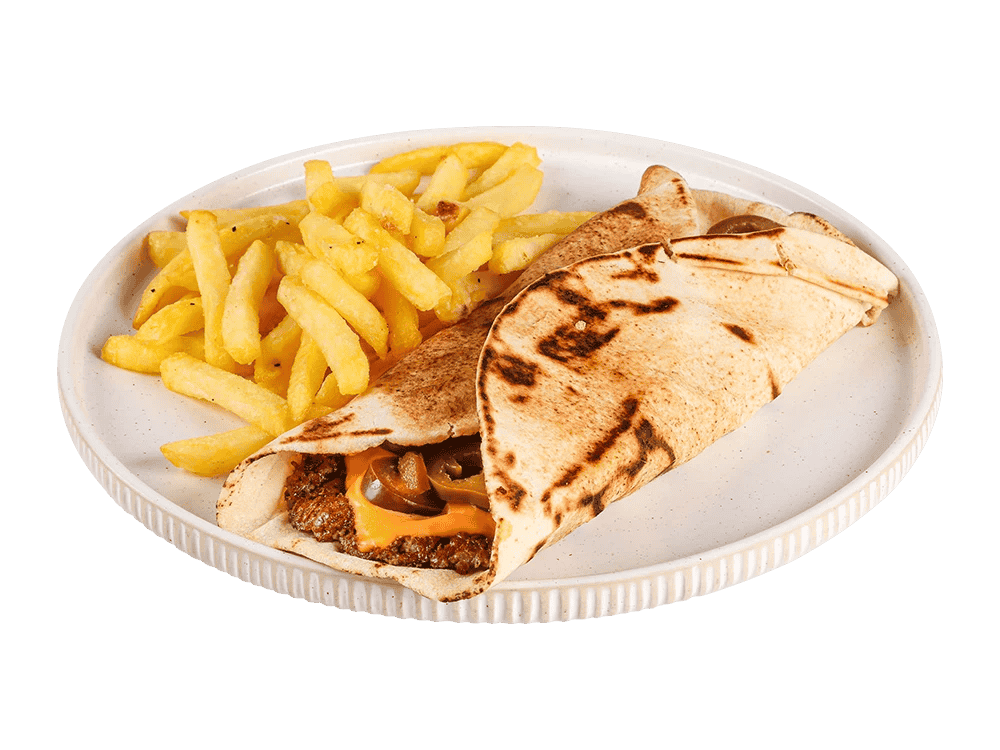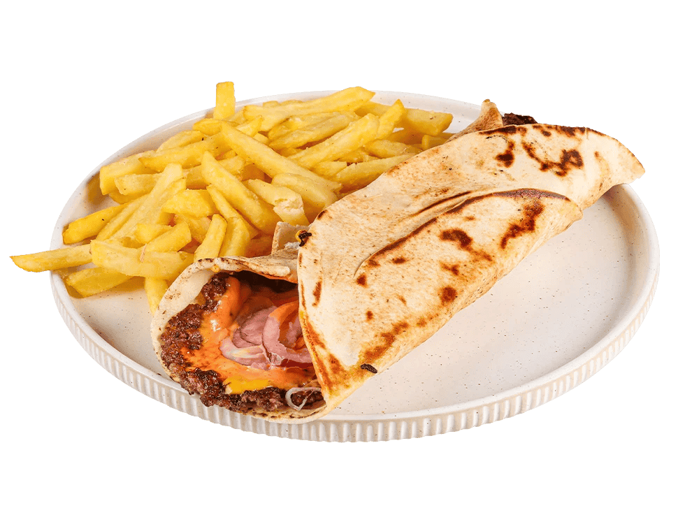 100% slovenska govedina, cheddar, solata, ocvrta čebula, garlic mayo omaka, krompirček.
