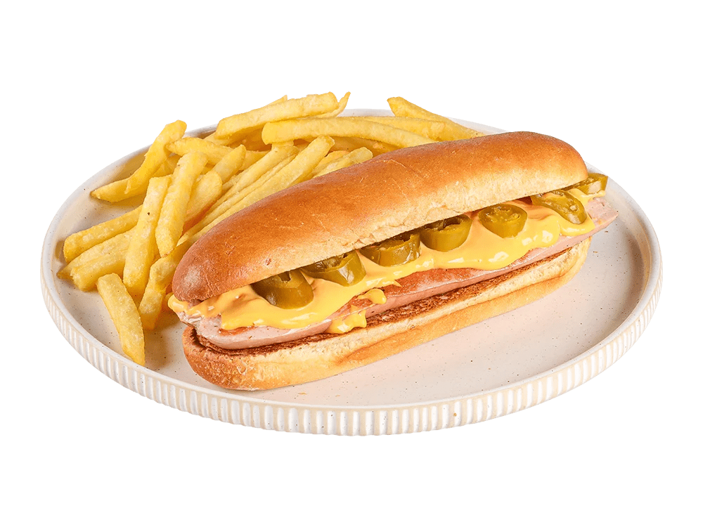 100% slovenska telečja hrenovka, cheddar, čebula, jalapeno, spicy mayo omaka, čili.