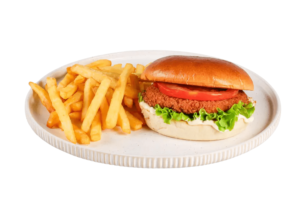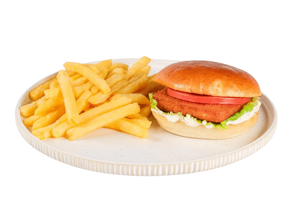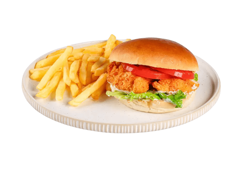 Ocvrt piščanec, solata, paradižnik, domača tatarska omaka, krompirček.