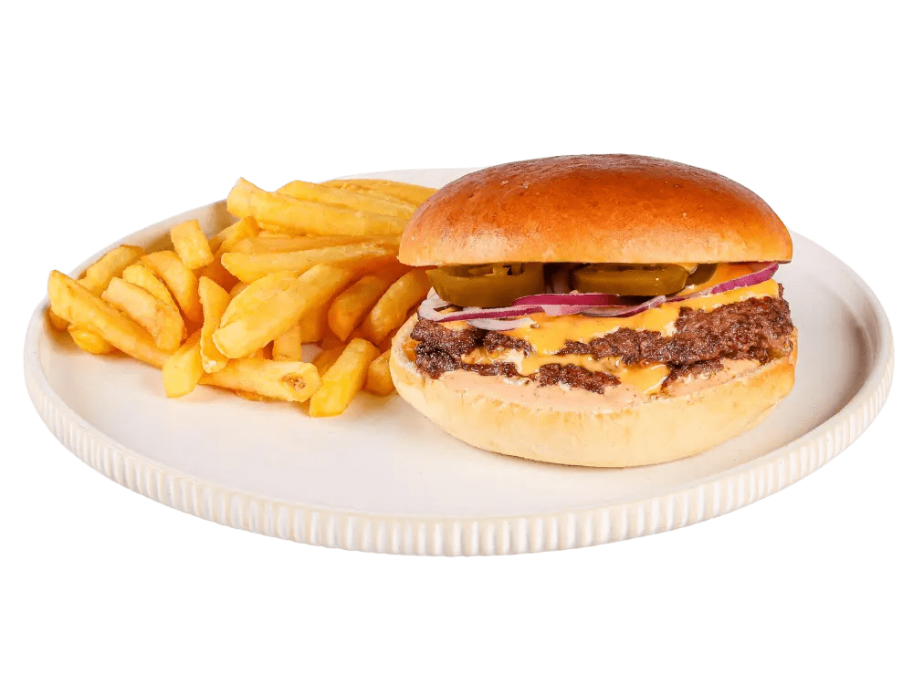 100% slovenska govedina, cheddar, rdeča čebula, jalapeno, classic omaka, chili omaka, krompirček.