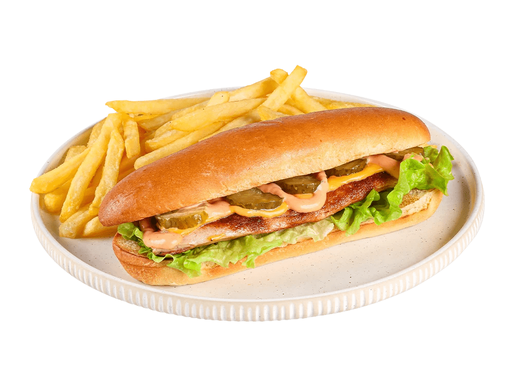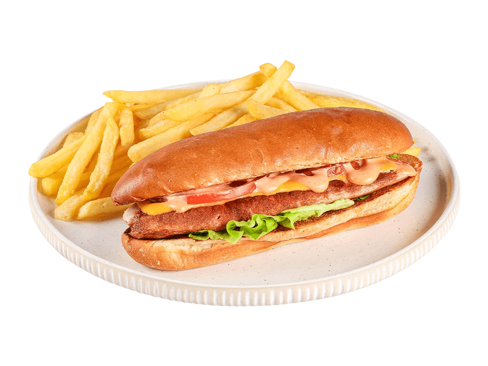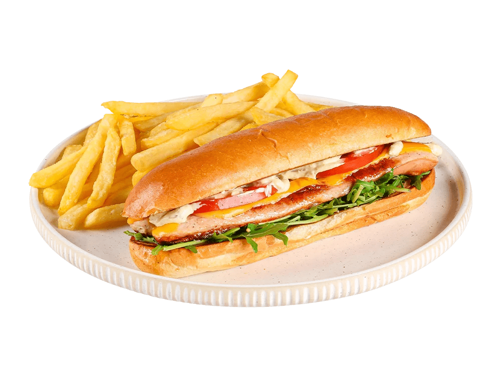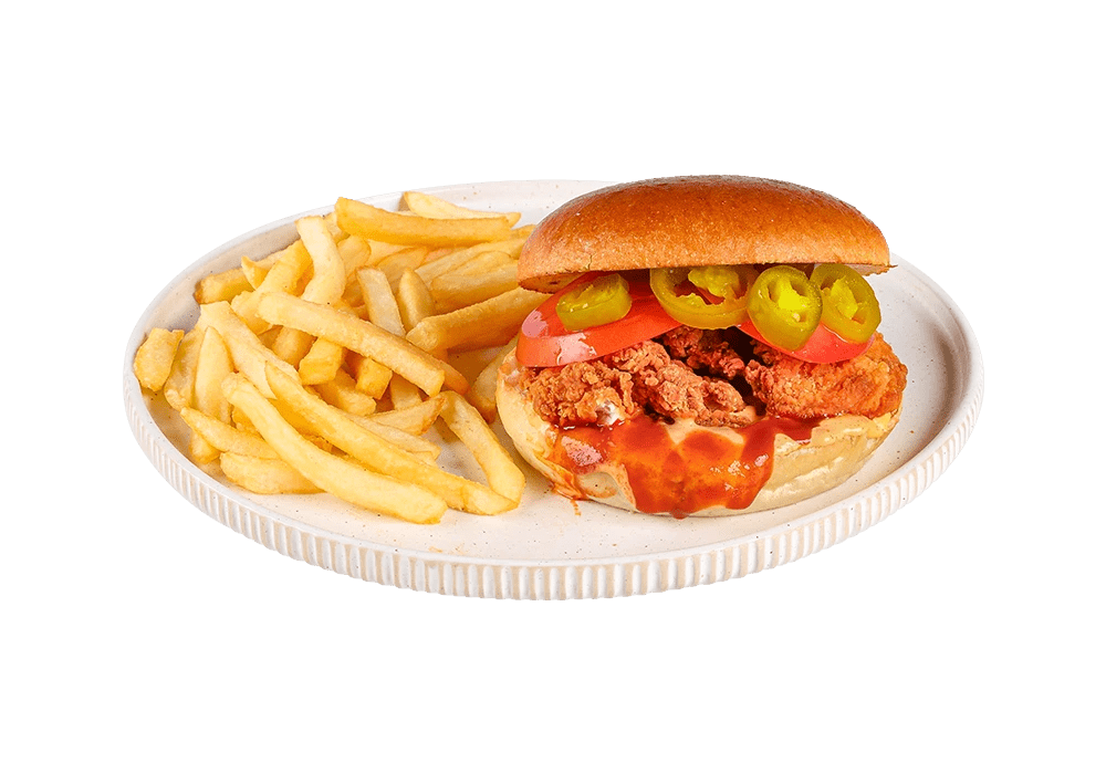 Pohan piščanec, jalapeno, paradižnik, spicy mayo, čili, krompirček.