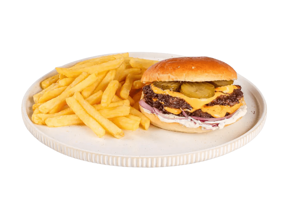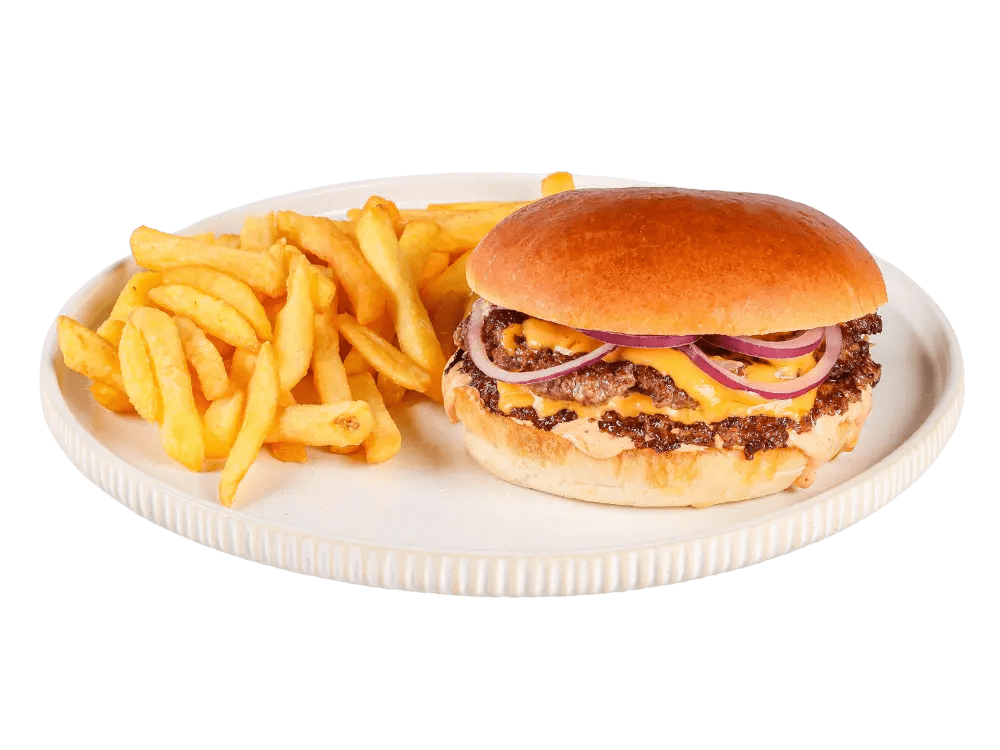100% slovenska govedina, cheddar, rdeča čebula, classic omaka, krompirček.