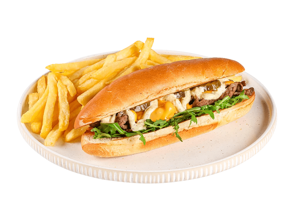 100% slovenski roastbeef, cheddar, čebula, kumarce, creamy mayo omaka.