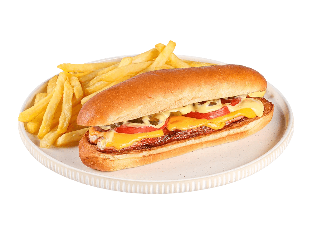 100% slovenska govedina, cheddar, paradižnik, kumarice, honey mustard, krompirček.